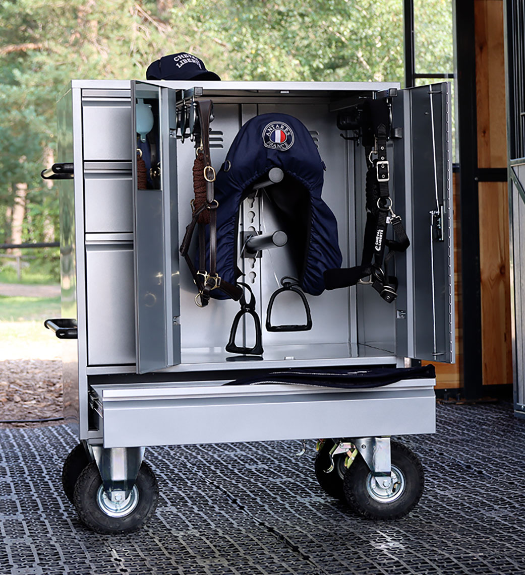 Équipée de roues solides, de poignées ergonomiques et de compartiments pratiques, cette sellerie mobile est conçue pour un usage intensif. Elle s’adapte parfaitement aux écuries professionnelles et aux cavaliers souhaitant allier style et efficacité.