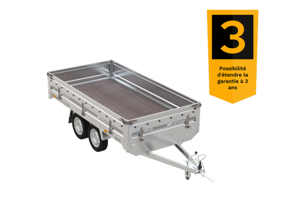 Remorque 2 essieux UNITRAILER SOLID 300/2 avec PTAC jusqu’à 750 kg. Extrêmement pratique grâce à la possibilité d’ouvrir ou de démonter toutes les ridelles, ce qui permet un chargement extrêmement facile ! Nous effectuons pour vous toutes les formalités.