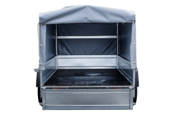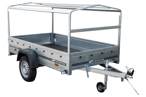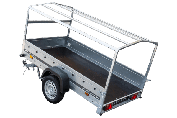 Remorque automobile avec bâche haute, arceau et roue jockey. UNITRAILER Garden Trailer 230 KIPP est le dernier produit de notre offre. C’est la plus grande remorque dans notre magasin avec PTAC jusqu’à 750 kg. Elle est équipée de la ridelle arrière ouvrable, ce qui rend facile le chargement et le déchargement de la cargaison. Grâce au timon pliable, elle peut être placée verticalement sur le panneau arrière. Nous faisons toutes les formalités liées à l’achat pour vous. La remorque est livrée à votre domicile avec tous les documents nécessaires pour l’immatriculer.