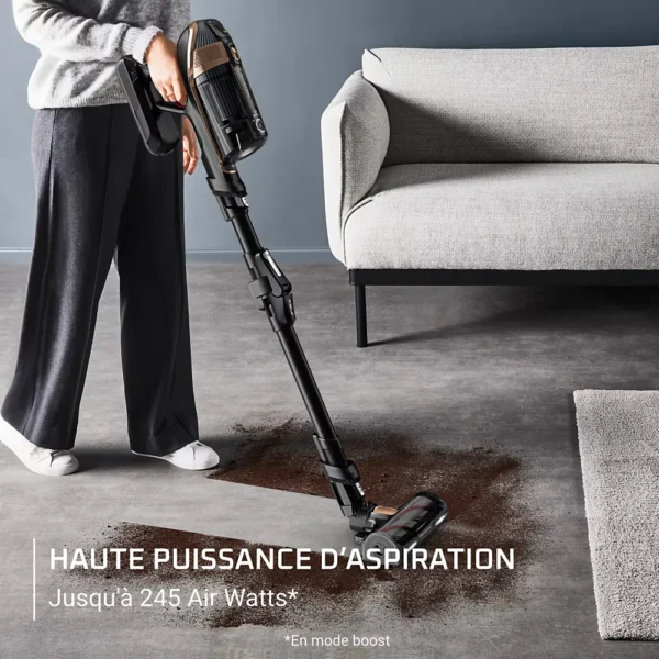 L’aspirateur balai ROWENTA RH99F3WO X-force Flex représente le summum de l’efficacité et de l’innovation. Avec sa technologie cyclonique et son moteur digital, cet appareil sans fil multifonction délivre une puissance d’aspiration exceptionnelle de 245 Air Watts, capable de venir à bout des saletés les plus tenaces sur tous types de sols. Sa tête d’aspiration rectangulaire est équipée d’un éclairage LED, permettant de détecter et d’éliminer efficacement la poussière dans les zones sombres. La filtration à 99,9% garantit un air plus pur, tandis que la capacité XL du bac à poussière de 0,9 L minimise les vidanges fréquentes, pour un nettoyage sans interruption.