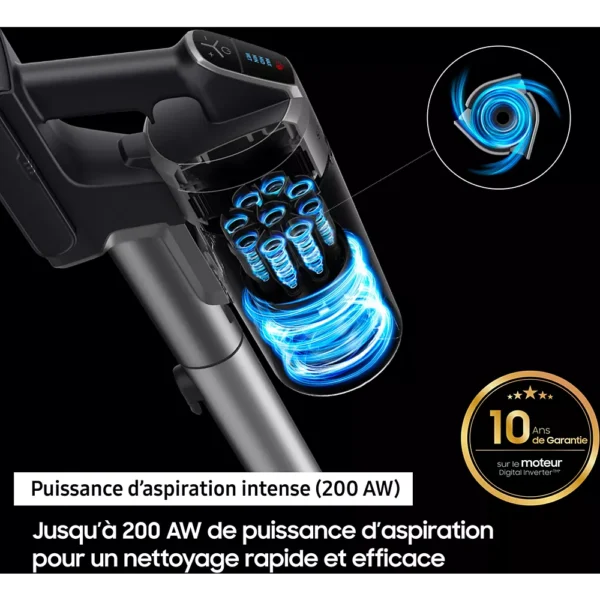 Le Samsung Jet 75E possède un moteur Digital Inverter doté d’un stator, d’un rotor et d’un ventilateur 3D améliorés qui lui permet d’aspirer intensément et efficacemment. Il allie une puissance moteur de 550W et une grande efficacité énergétique pour délivrer une puissance d’aspiration allant jusqu’à 200 AW.